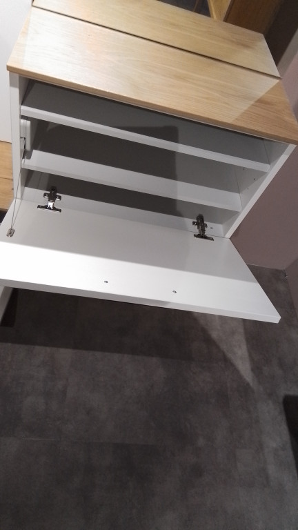 Korpus: Weiß Lack / Wildeiche Bianco Front: Weiß LackGriff: Metall schwarz mattAusstellungsstück!!!